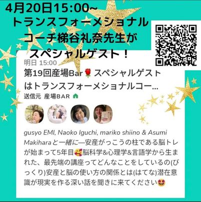 第19回産場Barのスペシャルゲストはトランスフォーメショナルコーチ梯谷礼奈先生です。