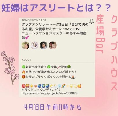第11回産場Bar(サンババー)は、クラファンリレートーク「自分で決めるお産」妊婦はアスリート!栄養学セミナーについてLOVEニュートリッションマスターのあすみ助産師が話します。